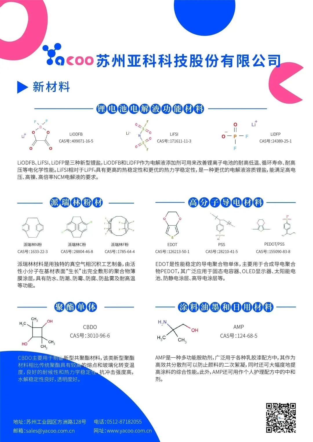 本次,亚科带来科技新材料有锂电池电解液功能材料、派瑞林粉材、高分子导电材料等高新技术型材料。