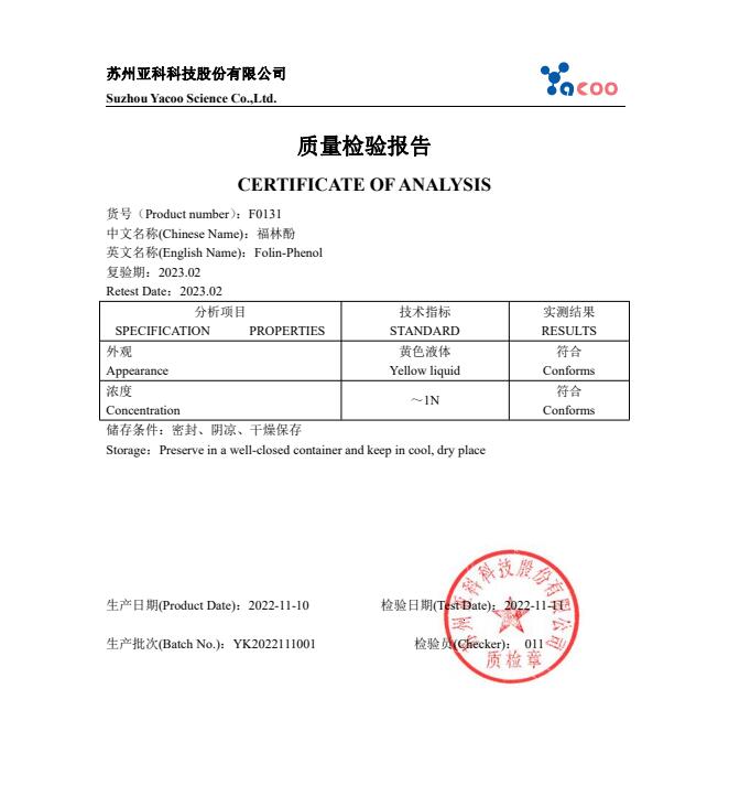 福林酚 | 产品质量检验说明书