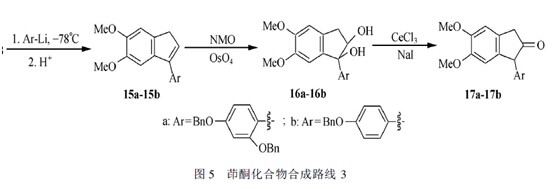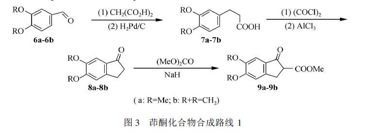 由芳基丙酸经分子内傅克环化反应来合成茚酮, 最常用的环化剂是多聚磷酸( PPA) , 但这种环化方法后处理非常麻烦, 产率也比较低。我们先将芳基丙酸7 制成酰氯, 然后再用三氯化铝来关环合成茚酮, 不仅总收率较高, 而且反应后处理比较简单。