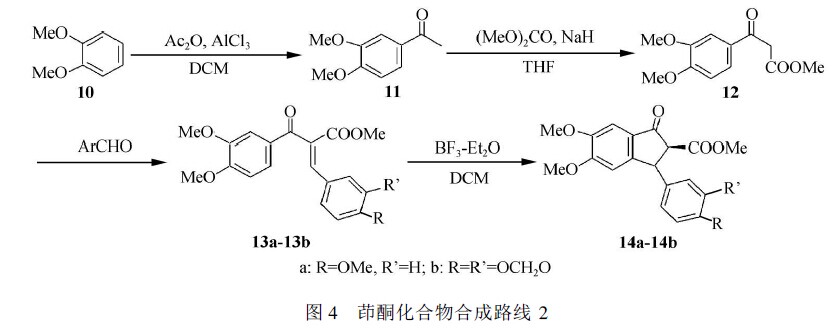 茚酮类化合物还是一类非常重要的有机合成中间体, 广泛用于很多药物分子的合成。鉴于茚酮化合物在有机化学及药物化学中的重要应用, 其合成方法研究也受到了广泛关注, 是有机合成的研究热点之一。虽然合成茚酮衍生物的方法比较多, 但绝大多数文献报道的都是小于1毫摩尔级的合成, 而且往往需要一些非常昂贵的试剂或催化剂, 或是比较苛刻的反应条件, 缺乏一种稳定可靠、可较大量地合成重要茚酮类化合物的方法。本文引述广西师范大学学报: 自然科学版报道以芳香醛或邻苯二甲醚为原料, 以分子Friedel-Crafts 酰基化、Nazarov 环化、Pinacol 重排等反应为主要合成策略,制备茚酮类化合物的3条合成路线。