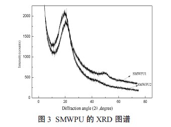 IPDI 由于其结构有序规整性较差,导致SMWPU1 硬段在49.5° 处只有微小结晶峰;SMWPU2 中硬段表现为非晶态,是由于TRIS分子为非线性结构,加入到预聚体中后,使硬段规整性变得更差,所以在SMWPU2 中49.5°处没有相应的结晶衍射峰。