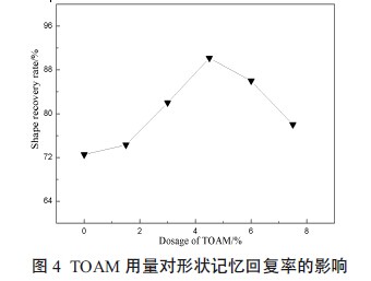 图4表明当TRIS用量为4.5%时,胶膜形状回复率为90.15%;因为硬段含量较低(<4.5%)时,硬段间分子力、氢键力等作用较弱,不能形成稳定的硬段微区。当TRIS为4.5%时,硬段含量相对提高,并且与链段间有一定交联,形成了比较稳定的硬段微区,有较强的氢键力,能形成物理交联点,对可逆相有束缚作用;当TRIS用量为6-7.5%时,硬段含量过多会嵌入到软段分子中去,严重破坏了软段的结晶性,导致形状回复率降低。