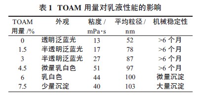 由表1 可见,乳液外观从透明泛蓝光向乳白色过渡,最后带有少量沉淀;当TRIS含量为