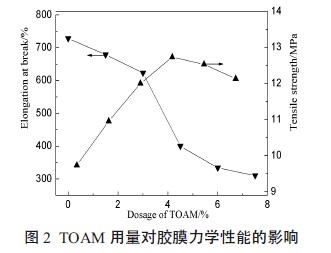 从图2可知,随着TRIS用量的增加,胶膜的断裂伸长率逐渐降低而拉伸强度呈现出先快速增大后缓慢降低的趋势。