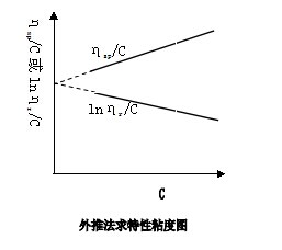上两式中κ和β分别称为Huggins和Kramer常数。这是两直线方程,通过ηsp/C对C或lnηr/C对C作图,外推至C=0时所得截距即为[η]。显然,对于同一聚合物,由两线性方程作图外推所得截距交于同一点,如下图所示。