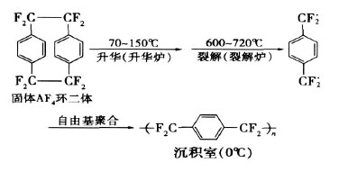 Paiylene AF4薄膜的制备同样采用化学气相沉积法,其化学反应方程式如图4所示。与Parylene系列的其他涂敷型材料所不同的是Parylene AF4所需的沉积温度较低,要求基体温度低于0℃,这是由亚甲基上F取代基所造成的。亚甲基上取代基团不同,由于空间位阻效应和电子效应的差异导致单体自由基的活性不同,进而使得沉积温度也略有不同, parylene N的沉积温度小于30℃, Parylene C的沉积温度小于90℃, Parylene D的沉积温度小于50℃。