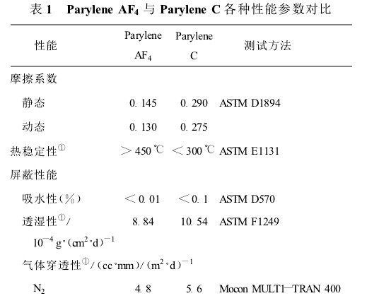 Paiylene C是该系列产品中性能较优、应用最广泛的物质。表1给出了Parylene AF4与Parylene C各种性能参数的比较。
