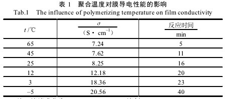 从理论上讲,降低聚合反应的聚合温度,能够有效降低聚合反应的速度,从而可以增长所生成的高分子链的长度,进而增强生成膜的导电性。不同温度下成膜的对比实验结果表明,降低聚合反应的温度可以提高膜的电导率,但会延长聚合反应时问。在-5℃下成膜时,反应非常缓慢,40 min溶液才变色(表明有一定PEDOT生成)。结果表明在3-12℃之间进行聚合反应,可以获得电导率较高的薄膜,且反应速度适中。