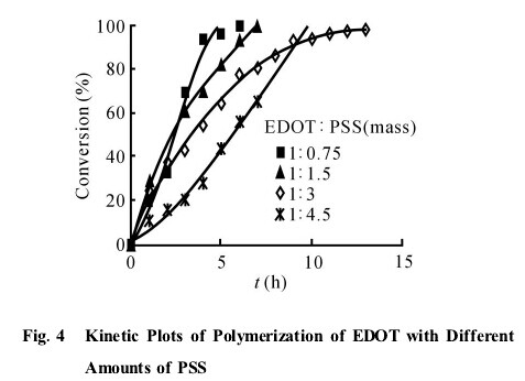 结论:模板及掺杂剂对EDOT聚合速率也有影响。PSS均聚物用量越多,EDOT聚合速率越慢,制备的PEDOT水分散体越稳定。用量相同时,以PSS与丙烯酸醋共聚物为模板,其相应EDOT聚合速率大于以PSS均聚物为模板及掺杂剂时的聚合速率,且共聚单体含量越多,EDOT聚合速率越慢。