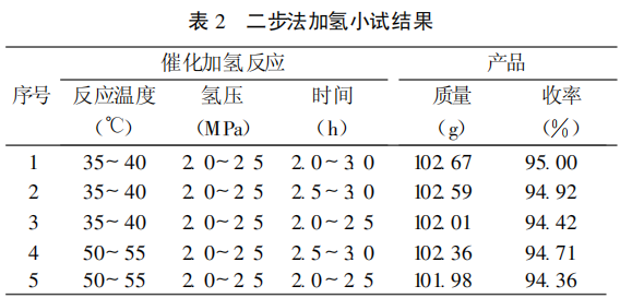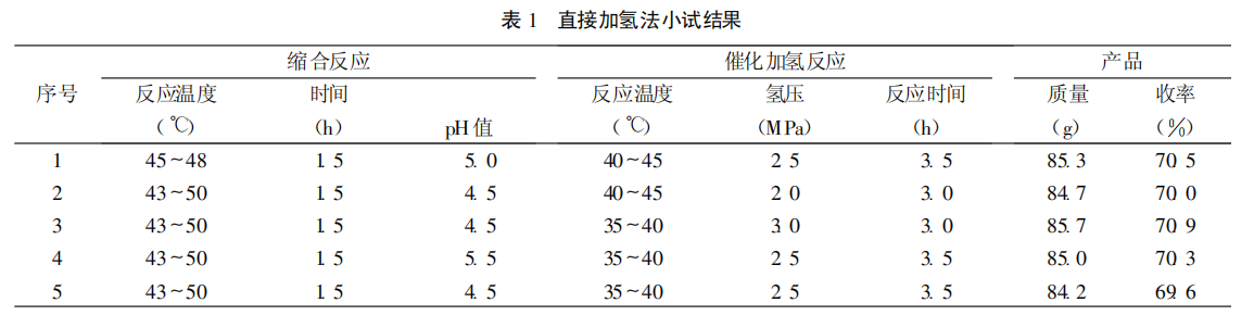 把缩合反应液加入2.0 L高压釜中,加入650 mol甲醇和10 mol 二氯甲烷,12g 兰尼镍。高压釜试漏合格后,用氮气、氢气转换4~5次,启动搅拌器,调节转速。慢慢升温,然后通入氢气,反应温度升到规定温度,在规定温度和压力下反应2.5 h,反应结束后,滤液倒入烧杯中,经盐水冷却到-5℃,白色结晶物析出后抽滤,滤液进行减压浓缩,再冷却结晶抽滤,同样方法处理3次,产品真空干燥。