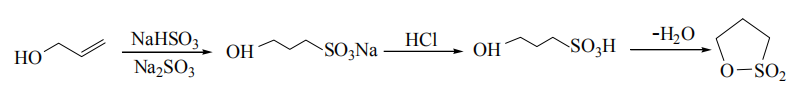 以丙烯醇为起始原料经与NaHSO3加成,生成3-羟基丙磺酸钠,酸化即得3-羟基丙磺酸,再减压蒸馏,分子内脱水,得1,3-丙磺酸内脂,合成路线为
