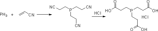 方法一:以磷化氢PH 3 为原料在高压釜中与丙烯氰反应,然后水解得到三(2-羰基乙基)磷盐酸盐(TCEP-HCl)。该方法虽然收率较高,但反应过程中需要使用高压釜以及剧毒气体磷化氢,危险系数高,不利于工业化生产。