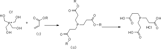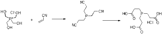 方法二:以四羟甲基氯化磷为原料,使其与丙烯氰反应,最后再用浓盐酸水解得到产物。该路线步骤简单,但是过程中产生的三氰基乙基磷酸性水解后得到三(2-羰基乙基)磷盐酸盐(TCEP-HCl)和氯化铵固体混合物,两种盐混合物无法实现有效分离,产物纯度低。