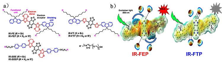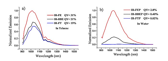 图2. a) IR-FE在甲苯中的荧光光谱及量子产率;b) 水溶性分子IR-FEP、IR-BBEP和IR-FTP的荧光光谱及量子产率。