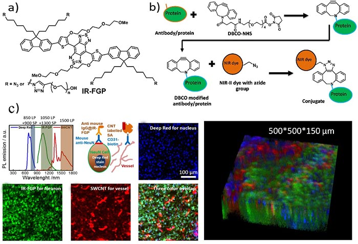 梁永晔课题组进一步合成了具有点击反应功能的荧光分子IR-FGP。该分子以三乙二醇(TEG)修饰的噻吩作为电子给体基团,可以增强荧光分子的溶解性并保持较高的量子产率(1.9%)(图3a)。荧光分子可以通过点击反应与特异性的抗体或蛋白高效结合(图3b)。戴宏杰课题组采用密度梯度离心法(DGU)实现了蛋白与荧光探针结合产物的纯化分离,获得了高纯度的近红外二区(1100 nm)荧光分子与抗体的结合体。在自建的共聚焦荧光显微镜下,实现了近170 μm组织学水平上的脑组织切片三维(3D)染色。另外,与碳纳米管(发射波长1500-1700 nm)和深色红(发射波长600-900 nm)这两种荧光探针结合,他们还实现了同时跨越近红外一区和二区窗口(800-1700 nm)上的多色分子三维层析组织成像(图3c)。该工作发表在PNAS 上[2]。斯坦福大学的博士后朱守俊、南方科技大学的访问学者杨晴来、斯坦福大学的博士后Alexander L. Antaris、博士生岳晶莹与马卓然为论文的共同第一作者。