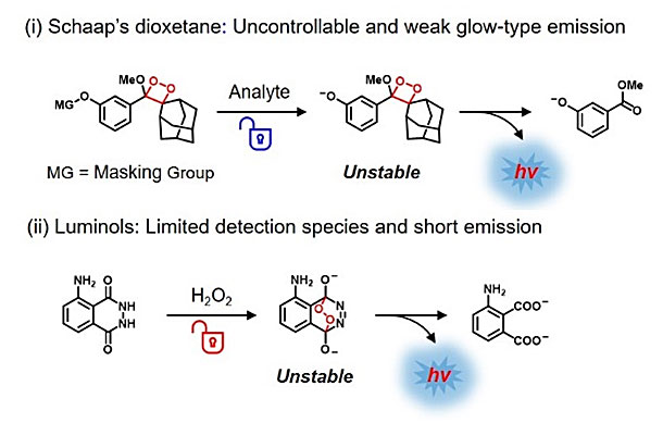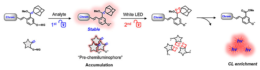 最近,华东理工大学郭志前教授(点击查看介绍)和朱为宏教授(点击查看介绍)课题组在化学发光探针设计中首次引入次序激活的双重锁定新策略,将识别过程和光子释放过程分离和顺序触发,实现了检测物与光控的次序性响应。在该策略中,底物分子首先与分析物识别作用生成稳定的中间体,并随着识别过程逐渐累积;其次在光控作用下生成1,2-二氧杂环丁烷的高能结构并释放出光子。稳定中间体生成不仅能够有效的富集化学发光信号,而且探针的稳定性得到极大的提升,有效解决了辉光型识别过程中光子释放不可控、发光信号弱,而闪光型因需要触发剂无法在生物活体内精准触发的难题。