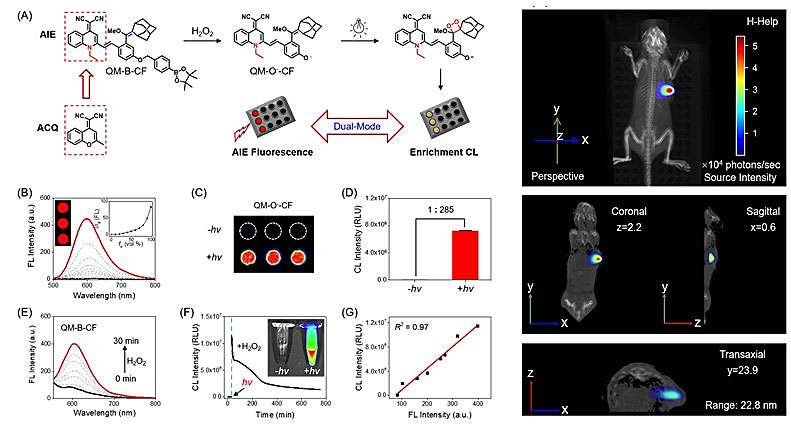 这种次序激活的设计策略具有较好的推广性,例如具有聚集诱导发射(AIE)特征的发色光团去替换原有的DCM基团,探针仍具备有次序性激活的特性,并且保留了新引入荧光团的特点,成功实现了活体成像中AIE实时荧光和超灵敏化学发光技术的结合。这类新型的化学发光探针在活体成像应用中取得了优异的成果,为该策略的拓展应用提供了坚实的基础。