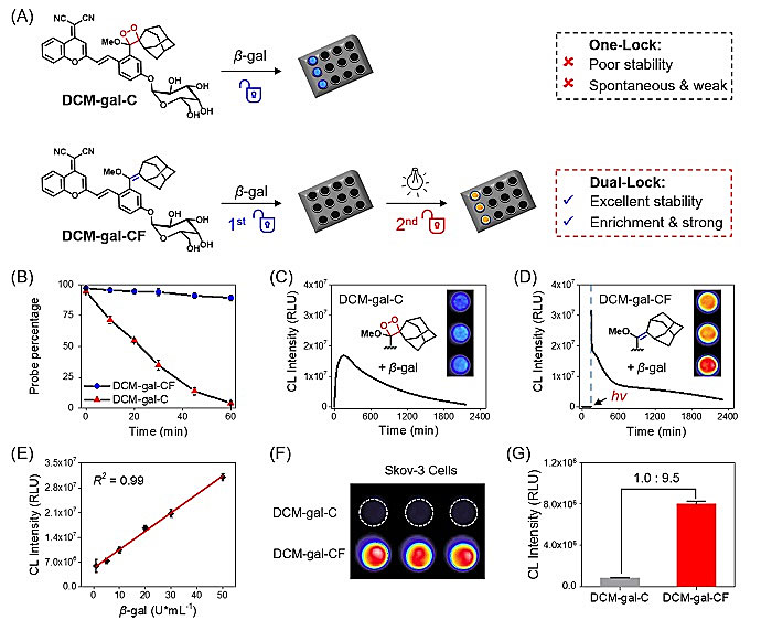 以β-半乳糖苷酶分子探针设计为例,精心设计了依次触发糖苷酶分析物和光释放的两个触发器,具体而言是设计单锁探针(DCM-gal-C)和双锁探针(DCM-gal-CF)。相比单锁探针DCM-gal-C,基于双锁次序性响应探针DCM-gal-CF的稳定性高与化学发光信号富集:稳定性提升18倍;与skov-3细胞孵育后,发光信号强度增强9.5倍。
