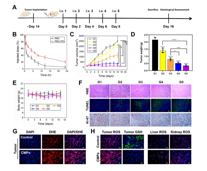 Fig. 4. (A) Schematic process for in vivo therapeutic efficacy process. (B) Pharmacokinetics of R6G and R6G-CPs. (C)Tumor volume changes during the treatments (n = 4). (D) The tumor weight of group G1-G5 and (E) Average body weight changes during treatments. (F) H&E, TUNEL and Ki67 staining of tumor tissues after various treatments. Scale bar: 100 μm. (G, H) ROS detection of tumor, liver and kidney by dihydroethidium (DHE) and GSH staining of tumor by Alexa Fluor® 488 dye. Scale bar: 50 μm. (Mean ± SD, n = 4). G1: PBS, G2: CAPs, G3: CPs, G4: MTO, G5: CMPs. *P < 0.05, ** P < 0.01, *** P < 0.001, ****p < 0.0001.