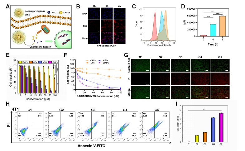 Fig. 3. (A) The scheme of CMPs endocytosis into cancer cells and intracellular released CASDB and MTO enhanced chemotherapy. (B) CLSM images of 4T1 cells treated with Rhodamine 6G@CASDB-PLGA (R6G-CPs) for different times, scale bar: 20 μm. (C, D) Cell uptake of Rhodamine 6G@CASDB-PLGA (R6G-CPs) analyzed by FCM (Mean ± S.D. n = 3). (E) Cell viability of 4T1 cells after various treatments (CAPs, CPs, MTO and CMPs). (Mean ± S.D. n = 6). (F) Cytotoxicity of free MTO, CAPs, CPs and CMPs against 4T1 cells after 24 h incubation (Mean ± S.D. n = 6). (G) Live/dead staining images of 4T1 cells of different treatments for 6 h. Scale bar: 100 μm. (H) Flow cytometry analysis of 4T1 cells stained with Annexin V-FITC/PI after treatment for 24 h: G1: Control, G2: CAPs, G3: CPs, G4: MTO, G5: CMPs. the concentration based on CA/CASDB :50 μM, or MTO: 20 μM. Data in the gate were shown as %. (I) Live/dead staining quantitative analysis using Image J. ** P < 0.01, ****p < 0.0001. G1: PBS, G2: CAPs, G3: CPs, G4: MTO, G5: CMPs.