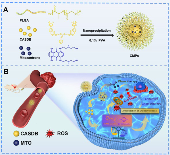 作者通过纳米沉淀法制备得到刺激响应性纳米粒子 (CASDB-MTO-PLGA Nanoparticles, CMPs),将CASDB与临床化疗药物米托蒽醌 (MTO) 和PLGA相结合。CMPs可通过高渗透长滞留效应(Enhanced Permeability and Retention effect, EPR effect)在肿瘤组织中达到预期的积累,从而有效诱导肿瘤细胞凋亡。特别是肿瘤部位的ROS可触发CASDB的牺牲,生成肉桂醛 (CA) 和醌甲基 (QM)。CA和QM协同促进氧化应激对线粒体的损伤,导致癌细胞对MTO更加敏感。同时,MTO扰乱癌细胞的细胞微环境,从而进一步促进CASDB的降解。