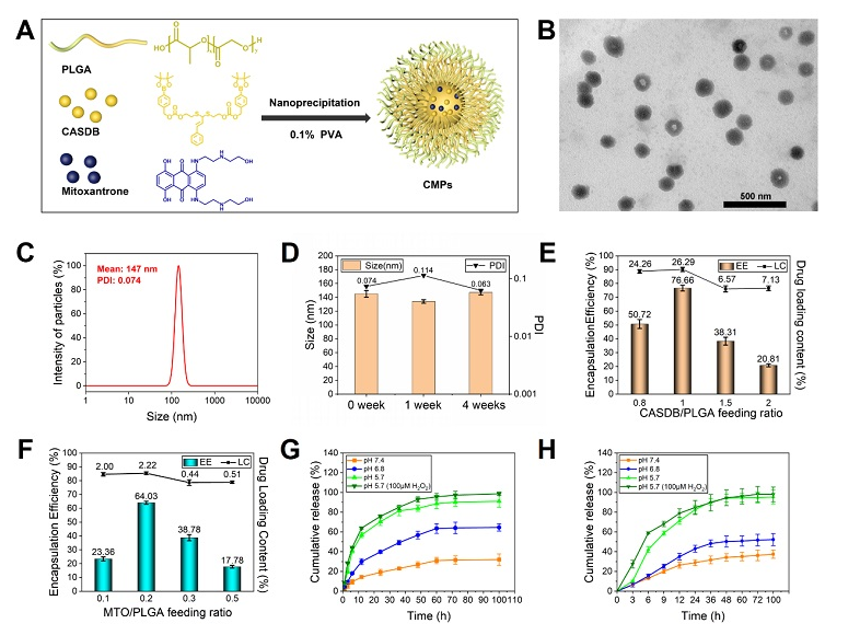 Fig. 2. (A) Schematic diagram of the preparation of CMPs. (B) TEM images of CMPs (1.75 mg/mL) at 0 week. Scale bar: 500 nm. (C) Hydrodynamic particle size distribution of CMPs 0 week and (D) 0, 1, 4 weeks, respectively. (E) Encapsulation efficiency of CASDB and Loading Content of CASDB in CMPs (F) Encapsulation efficiency of MTO and Loading Content of MTO in CMPs. (G, H) In vitro release profile of CASDB/MTO from CMPs in PBS under different pH conditions (with or without 100 μM H2O2).