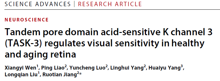 四川大学华西医院麻醉转化医学国家地方联合工程中心蒋若天研究员团队长期围绕离子通道参与感知觉神经环路调控/失调开展工作【13, 16, 17】。为验证TASK-3通道调控初级视觉神经环路这一科学假说,蒋若天研究员团队与四川大学华西医院眼科/眼视光学系展开合作,于2022年9月7日,在Science Advances杂志在线发表了题为Tandem pore domain acid-sensitive K channel 3 (TASK-3) regulates visual sensitivity in healthy and aging retina的研究论文,揭示了钾离子通道参与健康和衰老视网膜视觉信号调控新机制。