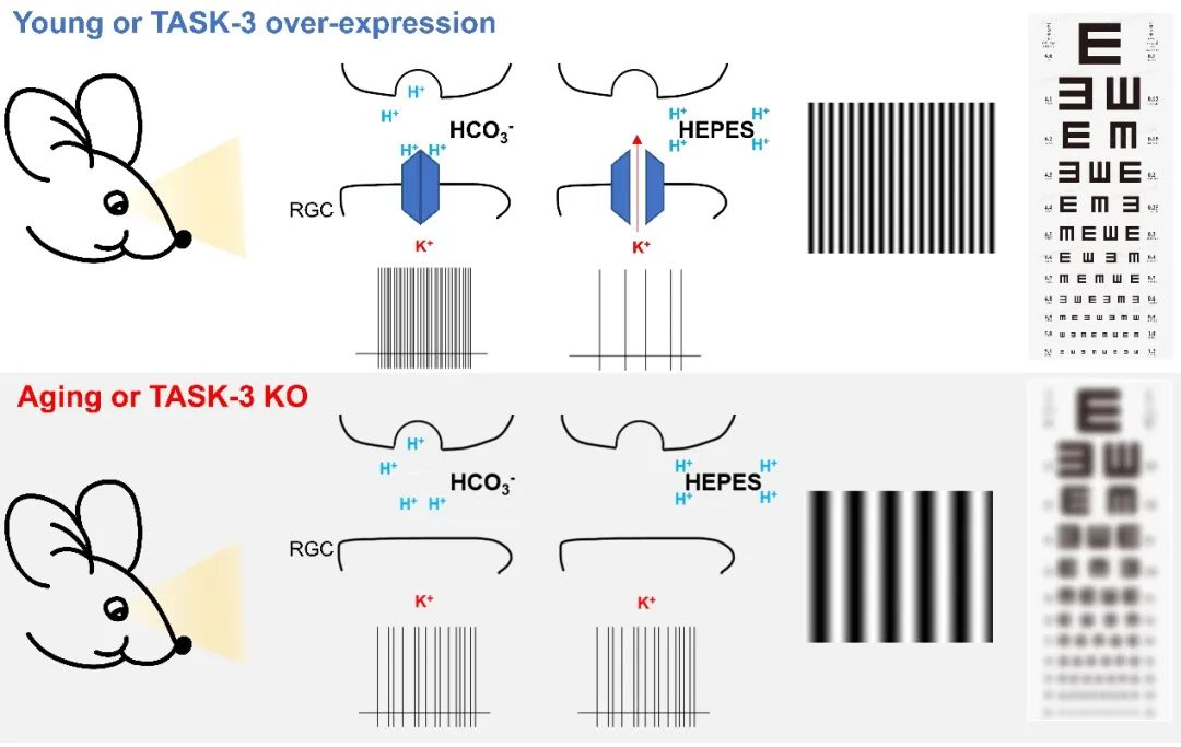 该研究发现了:(1) 双孔钾离子通道TASK-3在 RGC 中的显著表达,(2) 并通过感知神经元活动依赖性胞外酸化来调节 RGC 的兴奋性和光敏感性,(3) 从而调控瞳孔对光反射、视觉锐度、对比敏感度等非成像和成像功能。(4) 该研究还发现老年小鼠RGC中TASK-3 表达和功能降低;在 RGC 中特异性过表达TASK-3 可逆转衰老导致的视觉功能下降,将老年小鼠视力恢复到年轻小鼠水平。因此,该研究结果首次揭示了双孔钾离子通道在视网膜视觉信号处理中的新机制,并为减缓衰老过程中视觉功能的下降,提供了一个潜在的靶点与方法。