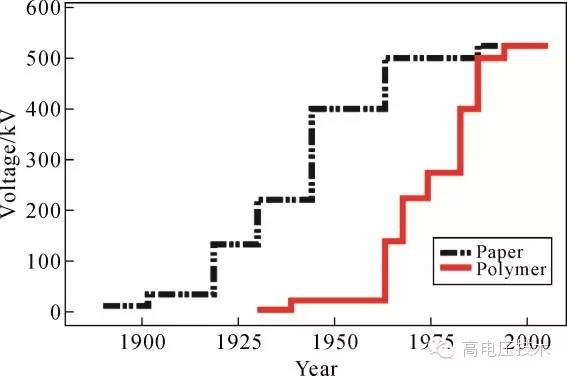 图2 电缆最高交流电压等级演变(图片提供:Nigel Hampton博士,NEETRAC)