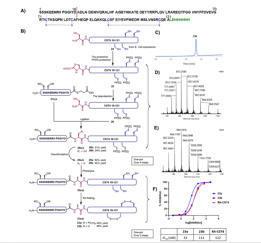 图5. CST4蛋白质的合成。A)蛋白质CST4的序列与逆合成分析;B)蛋白质CST4的合成;C)纯化后磷酸化CST4 23a的HPLC图谱;D)还原蛋白30a的高分辨质谱;E)折叠蛋白23a的高分辨质谱;F)合成CST4蛋白质23a和23b的抗木瓜酶活性测试。