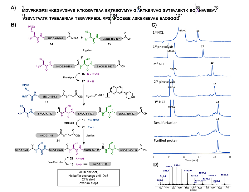 图4. SNCG蛋白质的合成。A)蛋白质SNCG的序列与逆合成分析;B)蛋白质FAM240A的合成;C)一锅法连续反应中的反应液HPLC图谱;D)产物13的质谱。