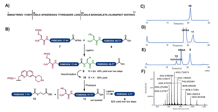 图3. FAM240A蛋白质的合成。A)蛋白质FAM240A的序列与逆合成分析;B)蛋白质FAM240A的合成;C)脱硫后片段10的HPLC图谱;D)光解反应液的HPLC图谱;E)一锅法第二次NCL的反应液HPLC图谱;F)产物6的高分辨质谱。