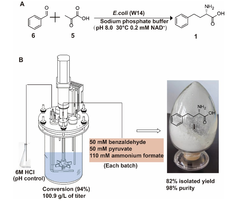 最终,在优化反应条件后,通过分批补料策略,在5 L规模的生物反应器中,实现了L-高苯丙氨酸的规模化制备,使L-高苯丙氨酸的产量达到100.9 g/L,转化率为94%。