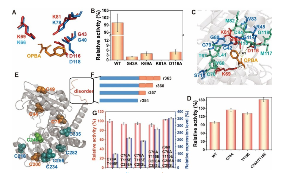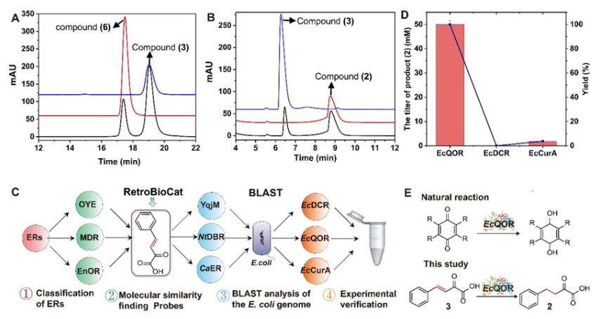 为了构建这一路线,通过多种酶筛选技术,筛选确定了催化每一步反应所需要的最佳路径酶。同时借助基因采矿技术筛选到一个不依赖于黄素辅因子的能催化不饱和酮酸的烯还原酶,这一还原酶具有较高的活性和稳定性,具有良好的商业应用潜力。在此基础上,作者对筛选获得的最佳路径酶进行了表达、纯化和体外组装,验证路径的有效性。并借助代谢工程手段在体内进行组装,发现苯丙氨酸脱氢酶的催化效率和低表达量成为路径的限速步骤,因此进行蛋白质工程改造,获得最优突变体,并借助半胱氨酸突变和对C端无序区的截短提高其在体内表达量,实现了菌体中的最佳酶配比,得到了最佳生产菌株。