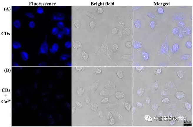 图2. HeLa细胞的共聚焦显微镜图像,在钙离子存在时,细胞中碳点的荧光明显减弱