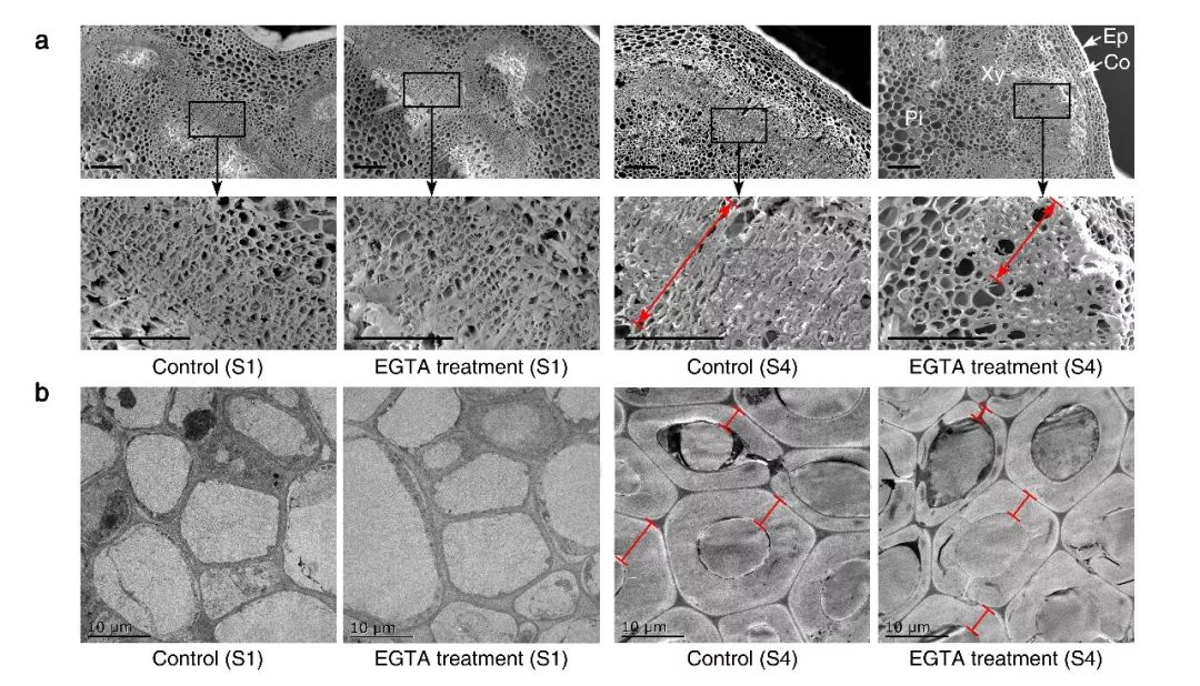 芍药是我国传统名花和新兴的高档切花。芍药花朵硕大而茎秆强度不足易致花茎弯曲、花朵下垂,严重影响芍药切花品质。作为细胞壁的组成成分和第二信使,钙在细胞壁形态结构维持和信号传导上发挥着重要作用。近日,Horticulture Research在线发表了扬州大学陶俊教授课题组的题为 EGTA reduces the inflorescence stem mechanical strength of herbaceous peony by modifying secondary wall biosynthesis 的研究论文。本研究采用钙离子专一螯合剂乙二醇四乙酸(EGTA)对芍药进行喷施处理,观察其对芍药花茎挺直程度的影响,探索了钙在芍药花茎挺直程度中的作用机制。