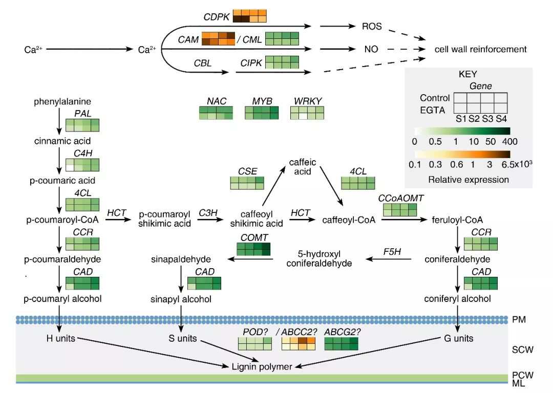 该研究显示,EGTA处理使得芍药切花茎秆强度降低、挺直程度减小。在EGTA处理后,花茎细胞壁中的钙含量减少;组织化学染色结果显示,木质部次生细胞壁的木质素积累显著降低;微观结构观察发现,木质部中次生细胞壁加厚的细胞层数减少、细胞壁厚度降低。应用蛋白组学分析筛选到响应EGTA处理的差异表达蛋白有43个,其中涉及信号传导相关蛋白8个、次生代谢相关蛋白15个;进一步应用qRT-PCR分析表明,EGTA处理显著下调了涉及钙信号传导和木质素生物合成的相关基因表达。