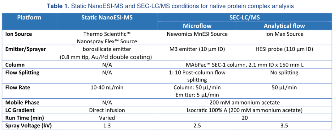 非变性质谱依赖静态纳米电喷雾质谱(nanoESI-MS)方法能达到较高的灵敏度,但其重现性和稳定性低且有复杂的样本前处理。然而,传统的LC-MS分析方法难以达到高灵敏度的效果。