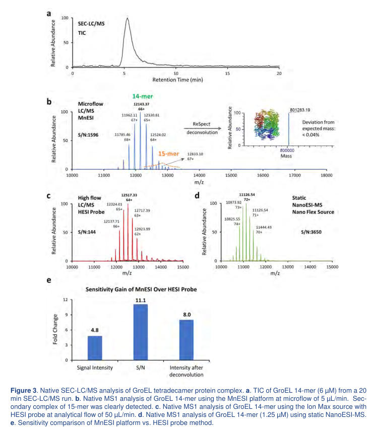 MnESI平台能够以自动化高通量方式实现对生物分子的分析,且能达到静态纳米电喷雾质谱无法实现的液相色谱分离。质谱前的在线液相色谱分离对于分析混合物中不稳定的蛋白质复合物至关重要,而且少于20分钟的梯度时间,在分析天然完整蛋白质和蛋白质复合物时具有更高的样品通量和分析鲁棒性,同时保持了灵敏度和数据质量。