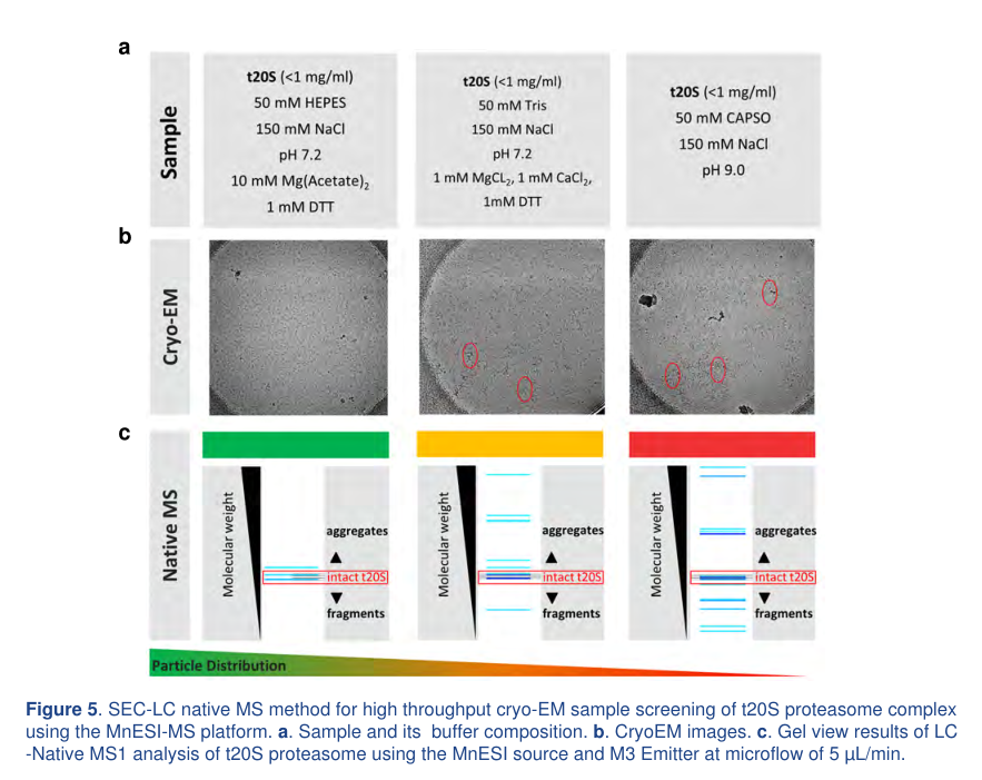 在对蛋白冷冻电镜分析之前需要了解样品的质量。在本研究中使用MnESI平台高通量筛选不同生物缓冲液中的20S蛋白酶复合物以确定冷冻电镜的最佳条件。从样品稳定性、样品均一性以及颗粒密度和分布等关键属性来评估冷冻电镜的最佳结果。最终HEPES 缓冲液被证实是最佳的冷冻电镜条件。此实验证实了MnESI平台可以被用来高通量的筛选将要冷冻电镜分析的样本。
