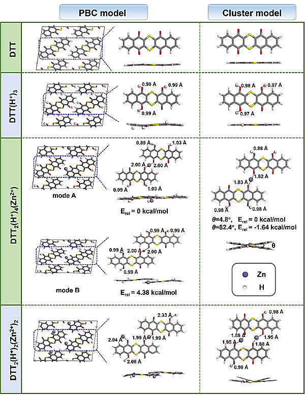 图3. 通过PBC模型和团簇模型得到的DTT, DTT(H+)3, DTT2(H+)4(Zn2+)和DTT2(H+)2(Zn2+)2的优化几何结构和相对能量(Erel)。紫色、红色、黄色、灰色、白色小球分别对应Zn、O、S、C、H原子。