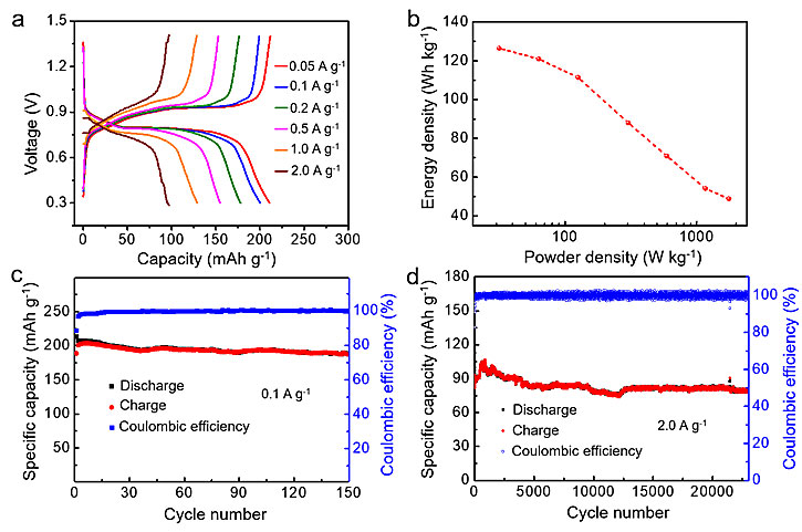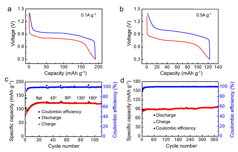 图4. (a, b)柔性电池在0.1和0.5 A g-1时的恒电流放电-充电曲线。(c)柔性电池在0.5 A g-1时由平面弯曲至180°时的循环性能。(d)柔性电池在1 A g-1时的长循环性能。