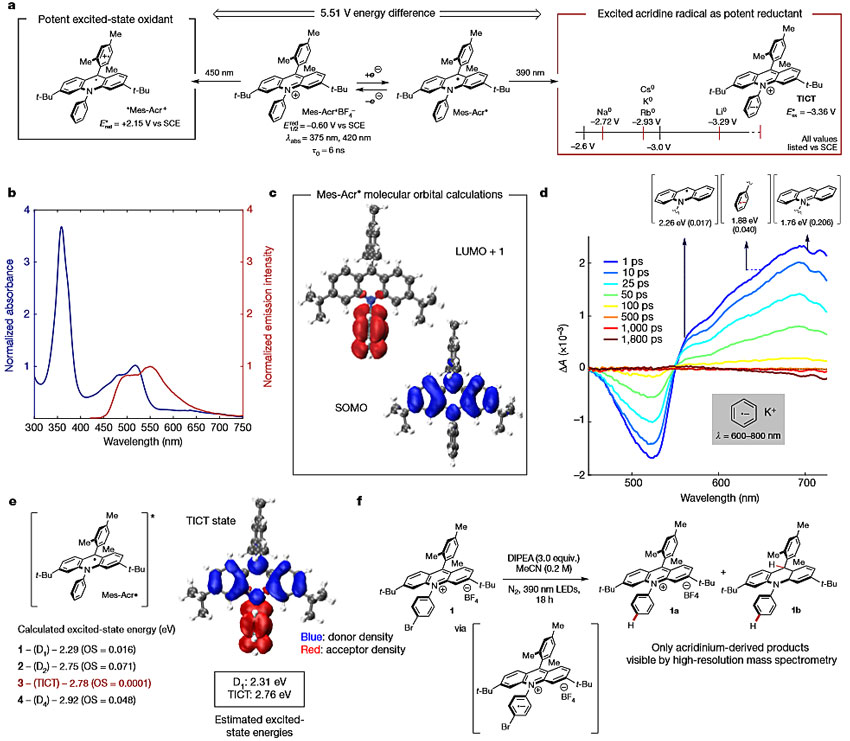 日前,美国北卡罗来纳大学教堂山分校化学系的David A. Nicewicz教授课题组在Nature上报道了一种新型光激发的中性吖啶自由基,其最大激发态氧化电位为-3.36 V(vs SCE),是目前报道的最强化学还原剂之一,还原性可媲美金属锂,可将卤代芳烃、对甲苯磺酰胺还原为C(sp2)-H、N-H键。光谱、计算和化学研究表明,扭曲的分子内电荷转移物种的形成使较高能量的双重激发态得以形成,从而实现超强光还原。
