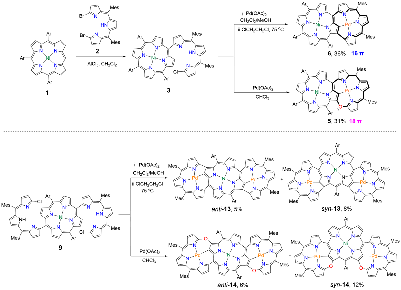 近年来,Tripyrrins发展成为构建新颖卟啉分子的重要模块。例如,2013年京都大学Osuka教授课题组从该模块出发合成了Pyrrole-strapped[26]hexaphyrin,2016年湖南师范大学宋建新教授团队用该模块合成了“耳坠型”卟啉。这些分子均表现出独特的电子结构和性质。近日宋建新教授团队周明波研究小组继续通过发展策略,在实现Tripyrrin与卟啉母体巧妙连接的基础上,合成了独具特色的共用吡咯单元的卟啉与N-错位型咔咯杂合体。反应中他们还意外发现了卟啉与N-错位型氧杂卟啉杂合体。