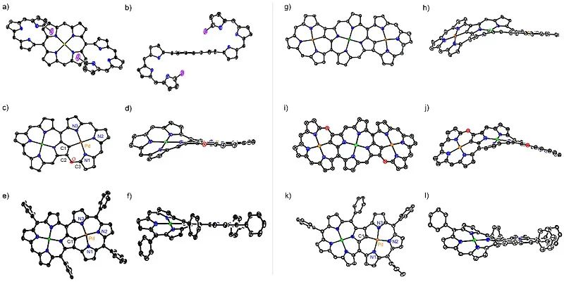 本研究对代表性杂合体的结构、芳香性、光谱性质以及电化学性质等进行了较为深入的研究。晶体结构表明,卟啉与N-错位型咔咯以及N-错位型氧杂卟啉单元均共平面,并且两者共用一个吡咯单元。核磁信息和计算结果表明N-错位型氧杂卟啉拥有18π共轭电子芳香结构,而N-错位型咔咯则具有16π共轭电子中度反芳香结构,并且这些局部电子性质影响分子的整体电子性质。紫外-可见吸收光谱以及电化学测试结果均佐证了N-错位型咔咯单元具有反芳香性,这与传统的咔咯以及已报道的N-错位型咔咯(18π共轭电子芳香性结构)完全不同。