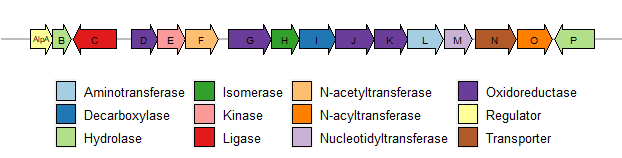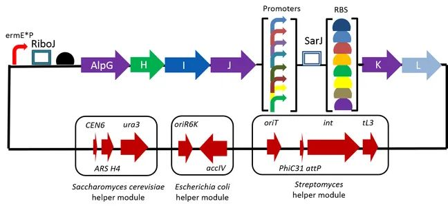 前期课题组负责人利用基因组挖掘技术从链霉菌NRRL B-24309培养粗提物中分离出两种膦酸类小分子抗生素,argolaphos A和B。两种化合物均由氨基甲基膦酸盐(AMP)与非标准氨基酸N5-羟基精氨酸形成肽键,而氨基甲基膦酸盐(AMP)可以成为合成草甘膦的前体小分子。课题组利用异源表达及生化方法鉴定了生物合成AMP所需要的六个结构基因(AlpG-L)并研究了其生物合成途径(图1),为合成生物学工程化改造提供基础(图2)。