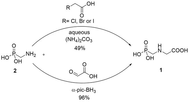 图3 使用启动子-绝缘子-RBS策略提高S.lividans 中AMP 的产量此外,课题组开发了一种将AMP转化为草甘膦的高效实用的化学工艺。课题组尝试了两种合成路线(图4),最终发现在水中进行还原胺化能高效合成草甘膦。在室温下使用α-pic-BH3在H2O和AcOH中完成AMP与乙醛酸的还原胺化1小时,草甘膦以高产率获得。以更大的规模(1克)进行相同的反应,并以相似的产率获得草甘膦。