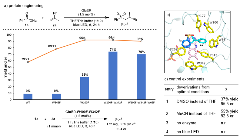 黄素依赖型的烯还原酶(ene-reductases, ER)在单电子还原引发的光酶催化体系中已被广泛使用。利用其发展单电子氧化启动的光酶催化反应的最大挑战在于如何避免蛋白中的一些易于氧化的氨基酸残基(比如含苯酚基团的酪氨酸以及含吲哚基团的色氨酸)被激发态的黄素蛋白氧化,从而对反应底物的氧化产生干扰。基于分子对接(图2b),作者对氧化葡萄糖酸杆菌(Gluconobacter oxydans)烯还原酶(GluER)活性口袋中离底物较近的色氨酸和酪氨酸进行了定点突变,经过多轮筛选最终发现GluER-W100F-W342F为最优突变体(图2a)。在最优反应条件下,模型底物1a 和2a能够以74%的收率和96:4 er值得到目标产物,且该反应可以放大到1.0 mmol规模。控制实验表明,烯还原酶和蓝光对于反应性至关重要(图2c)。