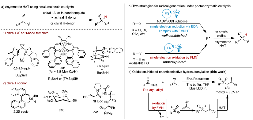 上海交通大学化学化工学院叶俊涛课题组在过去几年一直致力于光促氢原子转移反应的研究(J. Am. Chem. Soc., 2021, 143, 11251; Nat. Commun., 2022, 13, 4453; Angew. Chem. Int. Ed., 2023, e202309897)。对于不对称HAT反应,课题组在前期研究中发现基于多肽或糖骨架的硫醇是一类很有潜力的手性催化剂,成功实现了环外烯烃的不对称氘硼化、氘硅化、氘磷化和氘二氟烷基化反应(Nat. Commun. 2022, 13, 4453,点击阅读详细, Org. Chem. Front. 2023, 10, 1182),但对于非环状烯烃的反应,这类小分子硫醇催化剂的对映选择性控制则较差。受到上述单电子还原启动的光酶催化以及自然界中黄素依赖的脂肪酸光脱羧酶的启发,上海交通大学化学化工学院叶俊涛课题组与丁蓓课题组以及生命科学技术学院戴少波课题组合作,发展了一例单电子氧化引发的光酶催化体系,利用廉价易得的芳基或烷基亚磺酸钠盐为自由基前体,成功实现了非环状烯烃的对映选择性氢磺酰化反应,高产率和高对映选择性地合成了一系列手性砜类化合物。这一成果近期发表在J. Am. Chem. Soc.上,博士生史青龙为论文的第一作者。