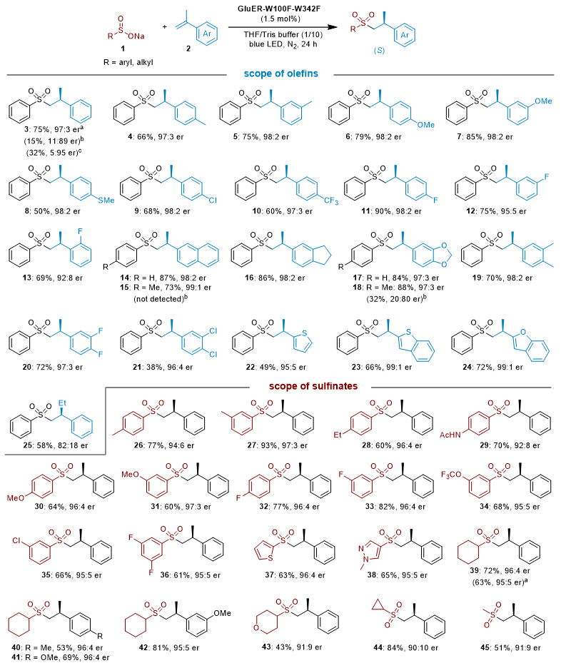 随后,作者对该光酶催化体系的底物范围进行了探索(图3)。首先,苯亚磺酸钠1a能够很好地和多种类型的α-甲基苯乙烯底物发生反应。如苯环的邻位、间位和对位可兼容带有不同电性的取代基,以良好的产率及对映选择性(92:8到98:2 er)得到氢磺酰化产物(4-13)。此外,该体系还可以兼容含有杂芳基的烯烃,包括2-噻吩基、2-苯并噻吩基和2-苯并呋喃基,能够以49-72%的产率和高对映选择性(最高99:1 er)得到相应的产物(22-24)。当使用α -乙基苯乙烯时,对映选择性有所降低(25,82:18 er)。另外,不同类型的芳基或烷基亚磺酸钠盐均可被该体系兼容,能以中等到优秀的产率和良好的对映选择性(90:10到97:3 er)获得氢磺酰化产物(26-45)。值得一提的是,使用酿酒酵母的老黄酶突变体(OYE1-Y196F)为催化剂,也能以对映选择性(95:5 er)得到R型产物3,尽管产率较低(32%)。手性砜化合物是有机合成的重要前体,也广泛存在于药物和生物活性分子中。因此,手性砜的制备成为合成化学家研究的热点。在本研究工作进行的过程中,浙江工业大学徐鉴课题组通过单电子还原引发的光酶催化策略实现了4-甲基苯磺酰氯和α-甲基苯乙烯的对映选择性氢磺酰化反应,并以优秀的产率和对映选择性得到R构型的砜类产物(Angew. Chem. Int. Ed. 2023, 62, e202218140)。与之相比,本研究中发展的氧化引发的体系更为简单,砜基自由基前体和烯烃的适用范围也更广。同时,使用烯还原酶GluER-W100F-W342F催化得到的是S构型产物,与徐鉴课题组的工作形成互补。